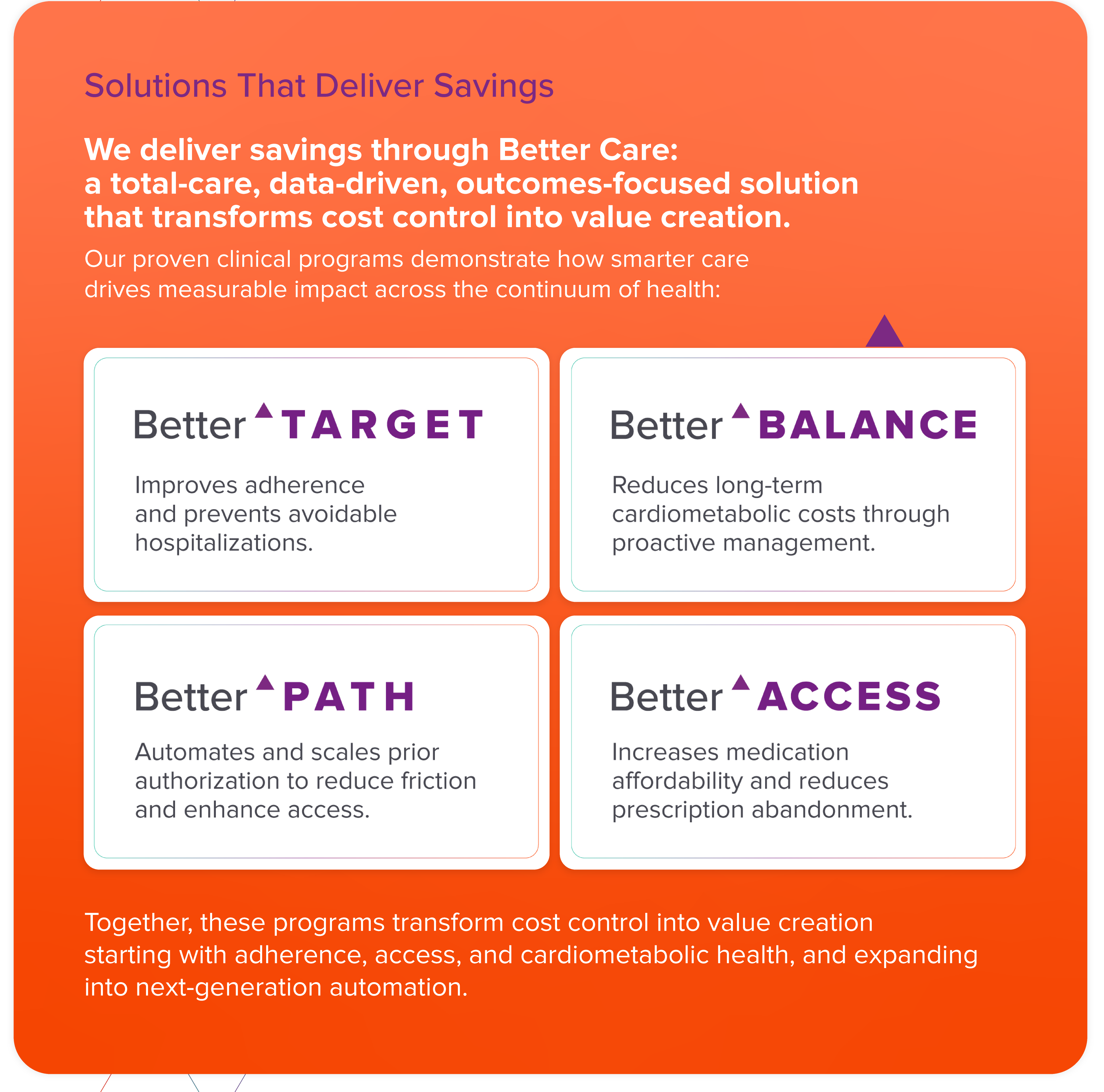 Together, these programs transform cost control into value creation starting with adherence, access, and cardiometabolic health, and expanding into next-generation automation.