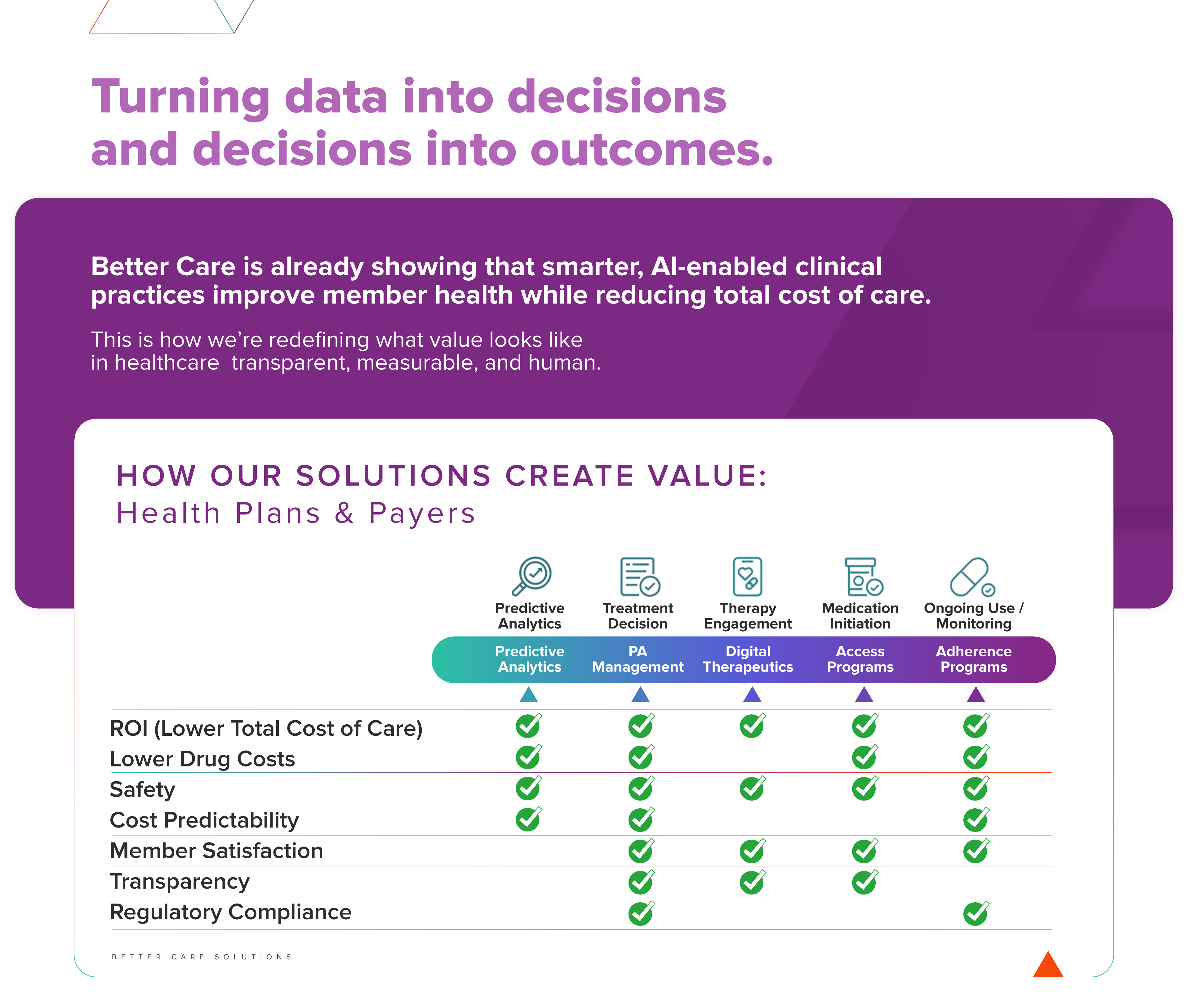 We deliver savings through Better Care: a total-care, data-driven, outcomes-focused solution that transforms cost control into value creation.