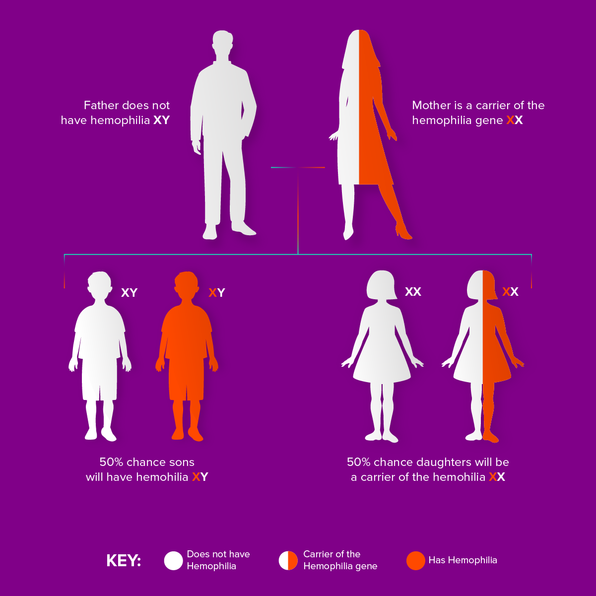 Inherited hemophilia is caused by a gene change with a protein factor that tells blood how to clot. Below is a perfect example of how someone with a genetically mutated chromosome and factors could affect someone. Uninherited hemophilia can also occur with no family history of it. There could be women who could carry it and not pass it.